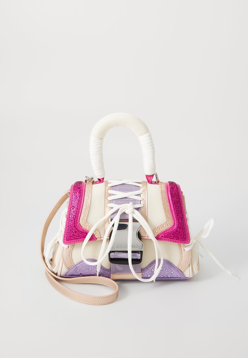 Bolsa de mão multicolorida com predominância do tom berry (framboesa), estruturada, com alça curta rígida e alça longa ajustável e removível. Design moderno da Steve Madden, com acabamento em materiais sintéticos premium e detalhes metálicos dourados. Fechamento superior em zíper, interior forrado com compartimento interno. Medidas: 24 cm (altura) x 30 cm (largura) x 12 cm (profundidade).