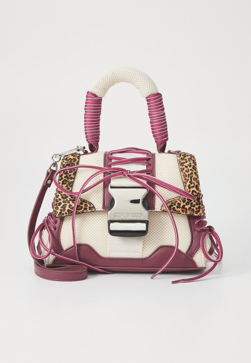 Bolsa de mão com estampa de leopardo da Steve Madden, estrutura firme e formato compacto. Confeccionada em material têxtil de alta qualidade, apresenta alça dupla e alça longa removível para uso transversal. Interior forrado com bolsos funcionais. Fechamento superior com zíper. Dimensões aproximadas: 24 cm (largura) x 18 cm (altura) x 10 cm (profundidade). Um acessório marcante para elevar qualquer look urbano ou casual-chic.