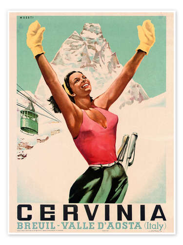 Traga a majestade dos Alpes italianos para o seu ambiente com o poster “Cervinia – Vale d’Aosta”. Este poster retrata uma mulher em primeiro plano, admirando a paisagem, com o bondinho que leva turistas ao cume da montanha ao fundo. Ao longe, o imponente pico nevado de Cervinia domina a cena, simbolizando a grandiosidade das paisagens alpinas e a temporada de esqui na região. Perfeito para quem deseja capturar a tranquilidade e a beleza do norte da Itália.